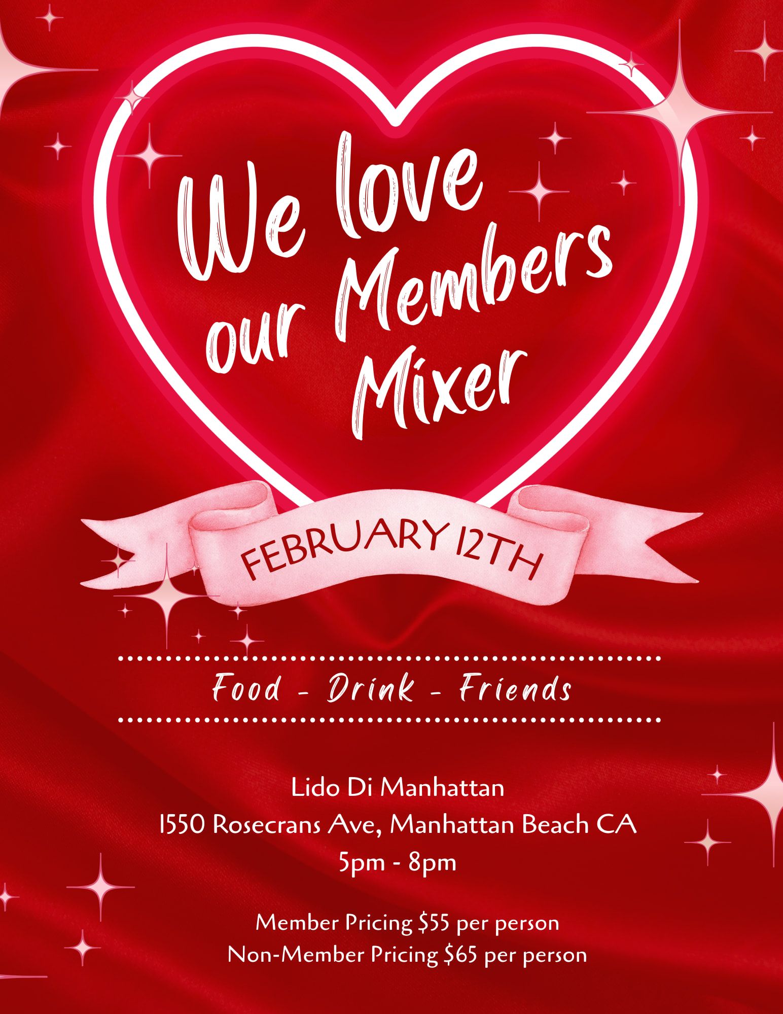 Join us for an evening of connection and conversation as you meet and mingle with fellow members while enjoying heavy appetizers and wine at the beautiful Lido di Manhattan.